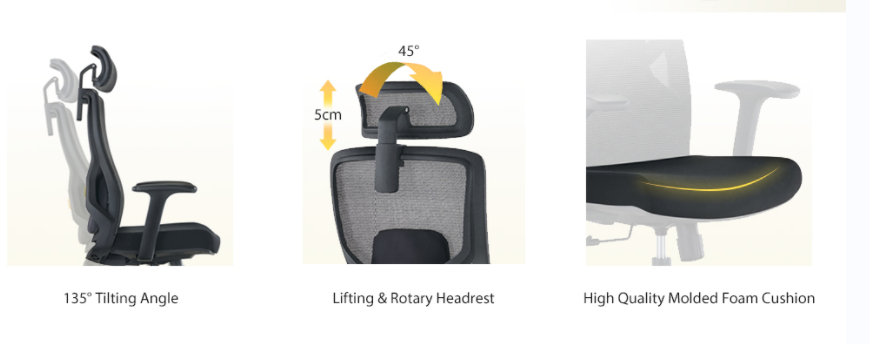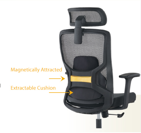 Bakpúðinn er festur með segulsog til að fylla bilið á milli lendar og baks þegar hallað er og dreifa þrýstingi sem stafar af því að sitja í langan tíma. Stóra memory foam púðann er einnig hægt að setja á framhlið stólbaksins og skrifborðið til ýmissa nota.