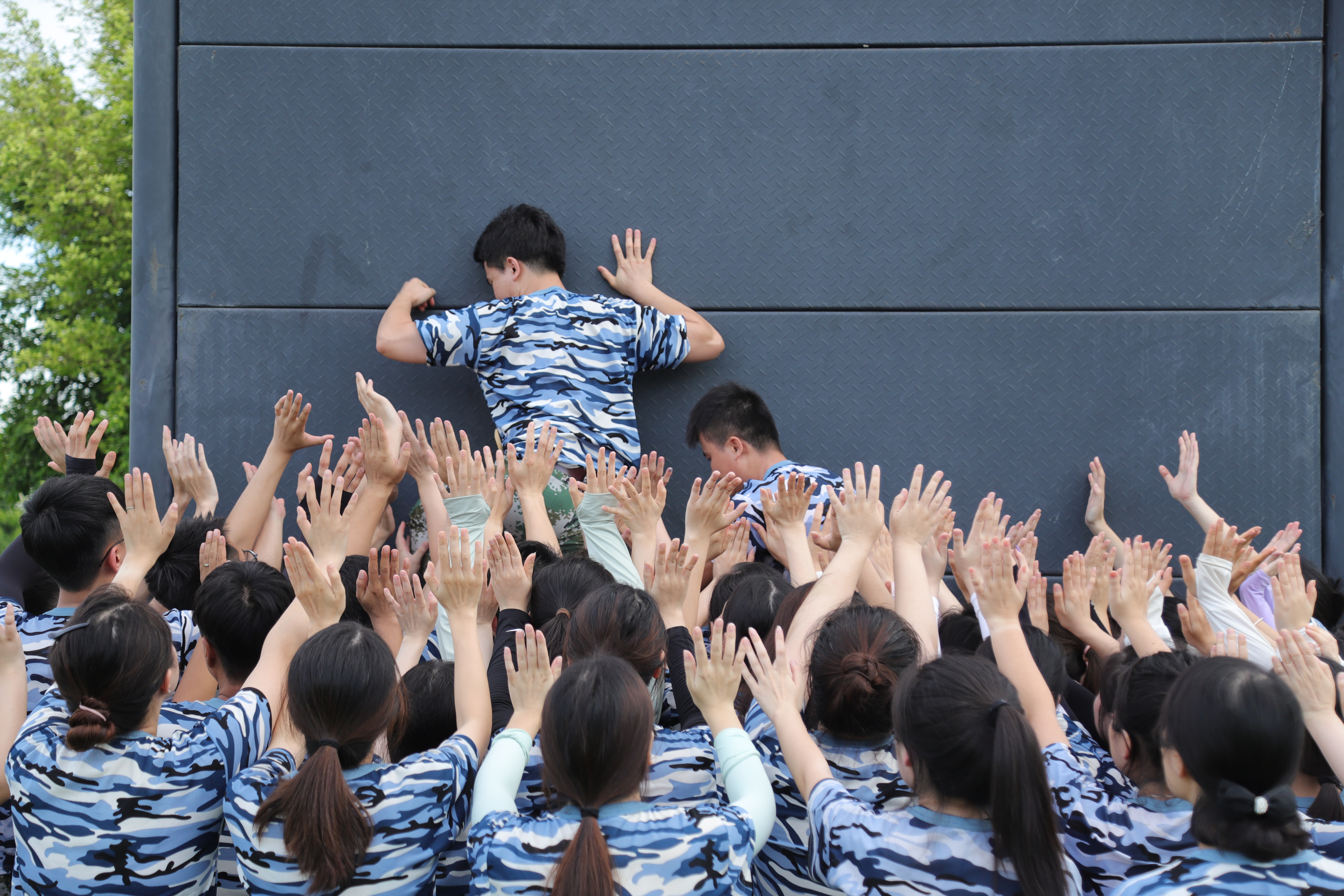 Iki uga nglambangake tantangan lan kesulitan sing kita adhepi ing karya lan urip. Tim kasebut nyawiji lan makarya bebarengan kanggo ngatasi tembok, nglambangake sukses ngatasi kesulitan lan entuk kamenangan.