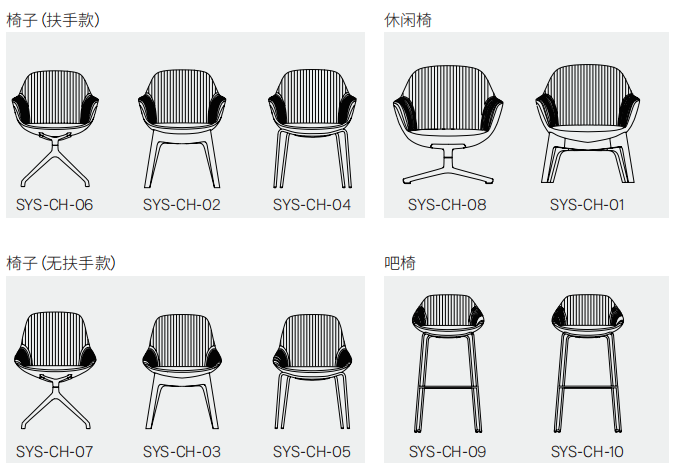 SYS, sistem anlamına gelir, bir sandalye serisi olarak SYS, kullanıcılarına, kolçaklı veya kolçaksız olarak sunulan şezlong, sandalye ve bar tabureleri ile salonda kullanılabilecek çeşitli tripod seçenekleri sunmaktadır. , kiler, müzakere, resepsiyon, yemek odası ve diğer ofis ve eğlence yerleri.
