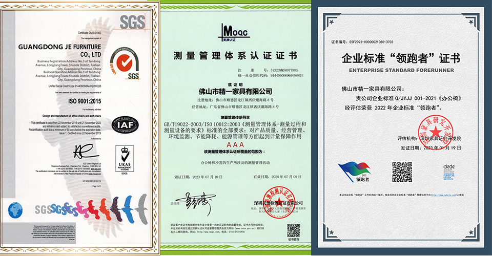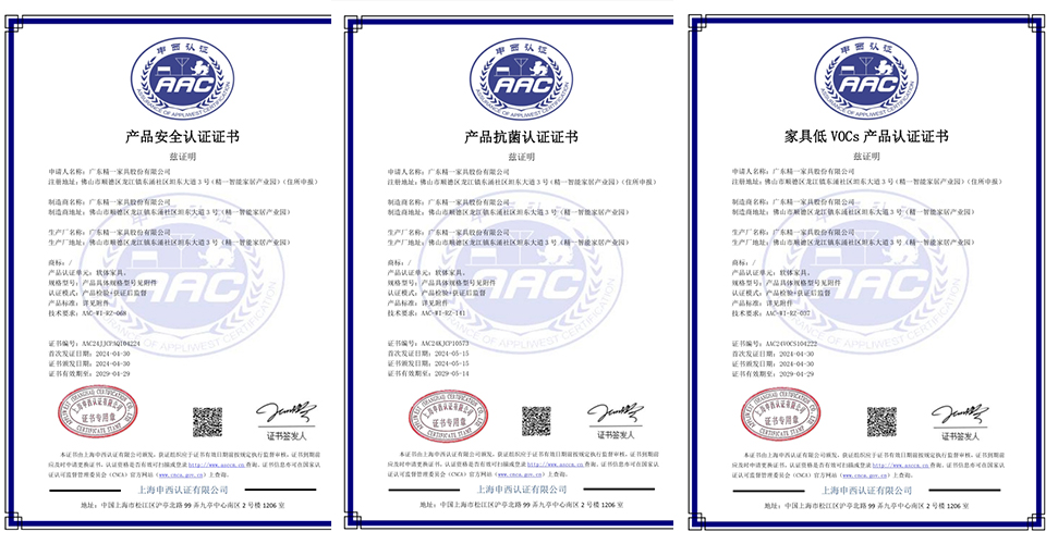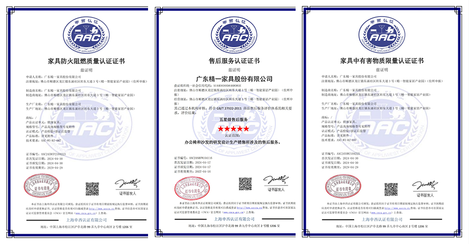 In terms of product quality, JE Furniture implements rigorous controls, continuously improving quality management levels, integrating and perfecting the ISO9001 Quality Management System and ISO14001 Environmental Management System, and introducing the IPD R&D system to achieve systematic management and standardized processes. Moreover, the company has obtained the GB/T 29490-2013 Intellectual Property Management System certification and multiple quality certifications, receiving authoritative recognition for its quality management capabilities.